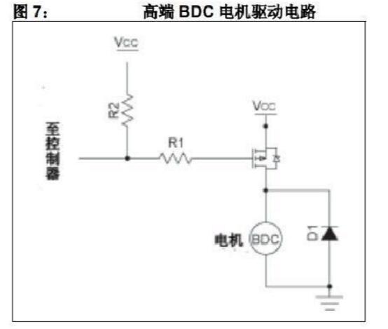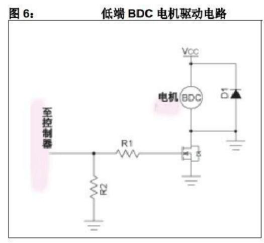 驱动电路用在使用了某类控制器并且要求速度控制的应用中。驱动电路的目的是为控制器提供改变BDC电机中绕组电流的方法。本节中讨论的驱动电路允许控制器对BDC电机的供电电压进行脉宽调制。就功耗来说,这样的速度控制方法在改变BDC电机的速度方面比起传统的模拟控制方法效率要高很多。传统的模拟控制要求与电机绕组串联一个额外的变阻器,这样会降低效率。驱动BDC电机的方法多种多样。 有些应用场合仅要求电机往一个方向运转。图6和图7给出了向一个方向驱动BDC电机的电路。前者采用低端驱动,后者采用高端驱动。 使用低端驱动的优点是可以不必使用FET驱动器。FET驱动器的用途是: