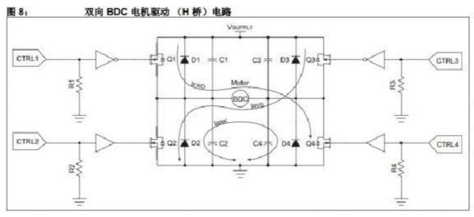BDC电机的双向控制需要一个称为H桥的电路。H桥的得名缘于其原理图的外观,它能够使电机绕组中的电流沿两个方向运动。要理解这一点,H桥必须被分为两个部分,或两个半桥。 如图8所示,Q1和Q2构成一个半桥,而Q3和Q4构成另一个半桥。每个半桥都能够控制BDC电机一端的导通与关断,使其电势为供应电压或地电位。例如,当Q1导通,Q2关断时,电机的左端将处于供电电压的电势。导通Q4,保 持Q3关断将使电机的相反端接地。标注有箭头的IFWD显示了该配置下电流的流向。