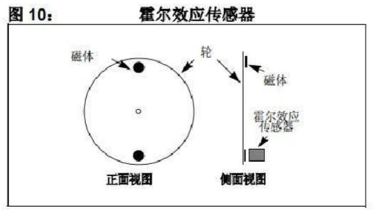 霍尔效应传感器也被用来提供速度反馈。与光学编码器类似,霍尔效应传感器需要电机上连有一个旋转元件,并且还需要一个静止元件。旋转元件是一个外缘安装有一个或多个磁体的转轮。静止的传感器检测经过的磁体,并产生TTL脉冲。图10显示了霍尔效应传感器的基本组成部分。