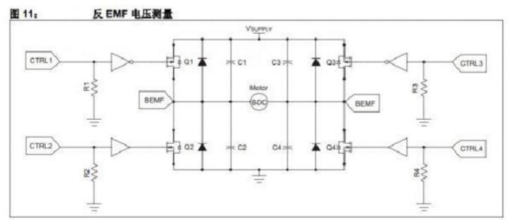 提供BDC电机的快速反馈的另一种形式是BEMF电压测量。BEMF电压和速度成正比。 图11显示了在双向驱动电路中测量BEMF电压的位置。一个分压器用于使BEMF电压下降到0-5V范围内,这样才能被模数转换器读取。BEMF电压是在PWM脉冲之间,当电机的一端悬空而另一端接地时测量的。在这种情况下,电机充当发电机,并且产生与速度成正比的BEMF电压。